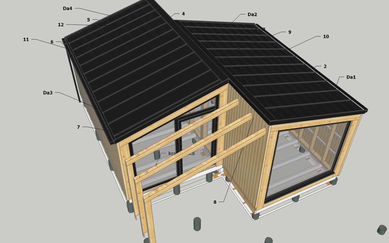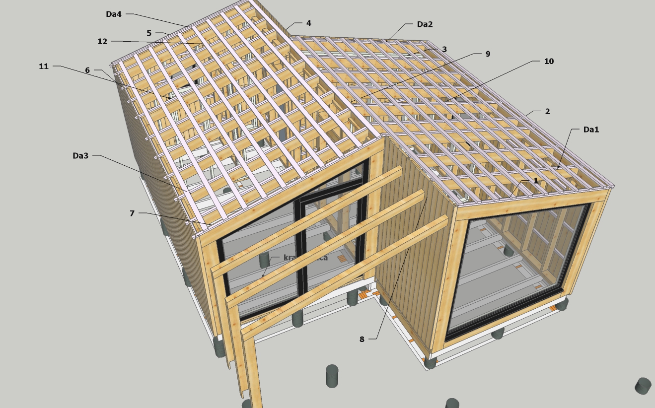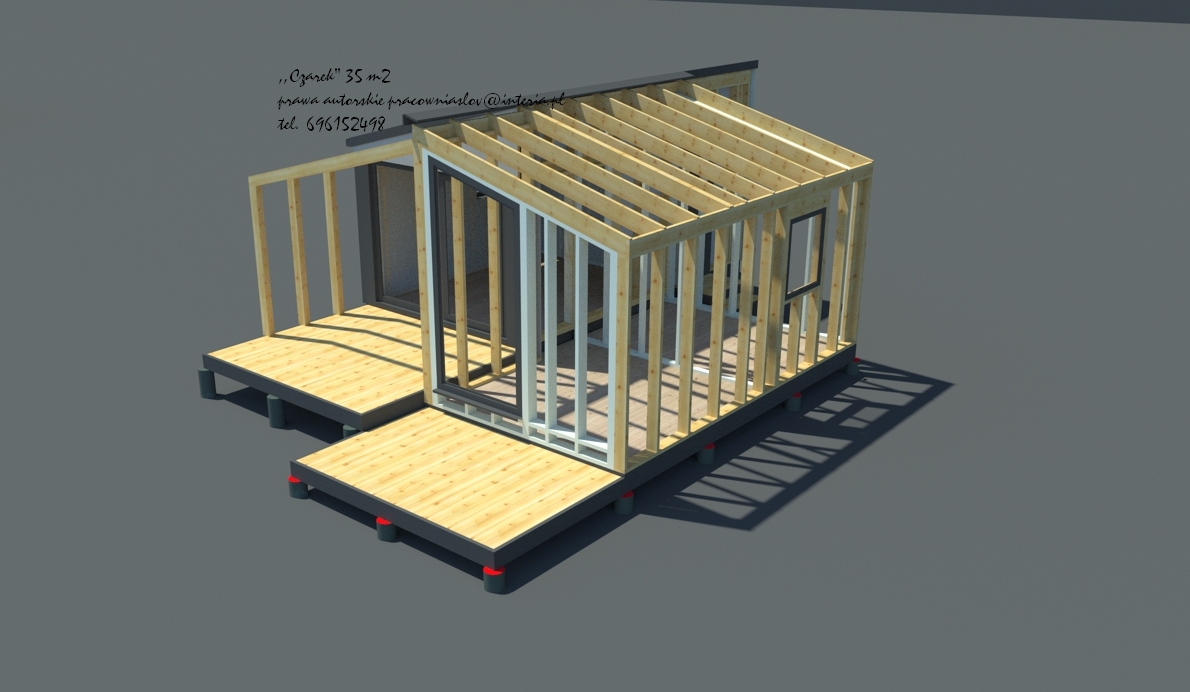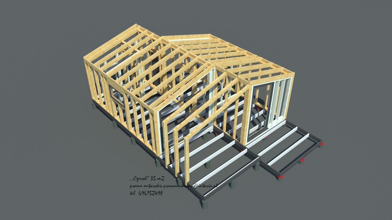 • Konstrukcja domu szkieletowego z przekroju belek 160/60 świerk C24+płyta konstrukcyjna P5 + płyta drzewna pióro-wpust (Naturheld wand 60mm) ściany z zewnątrz + tynk elewacyjny