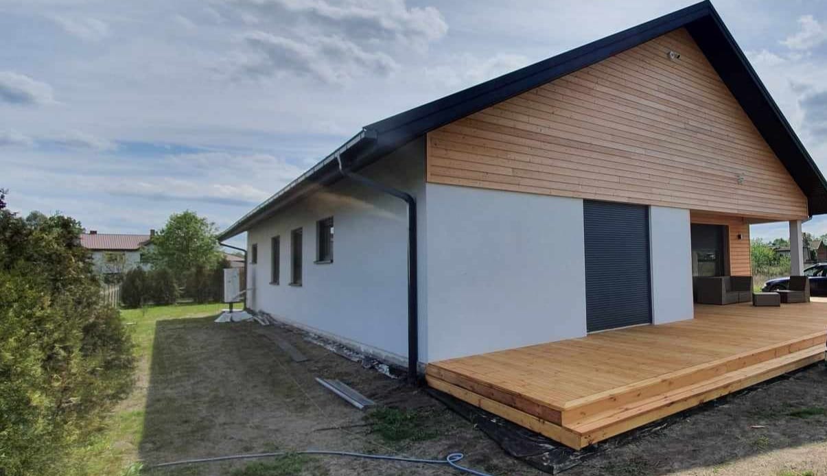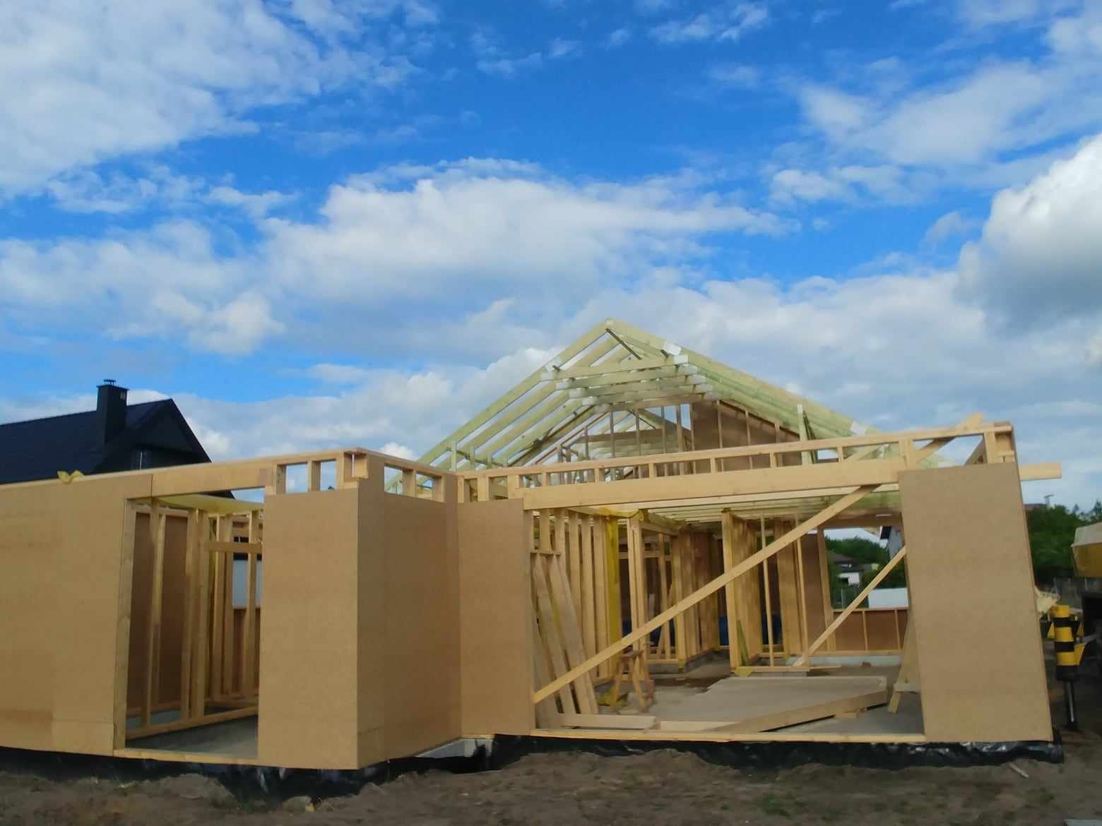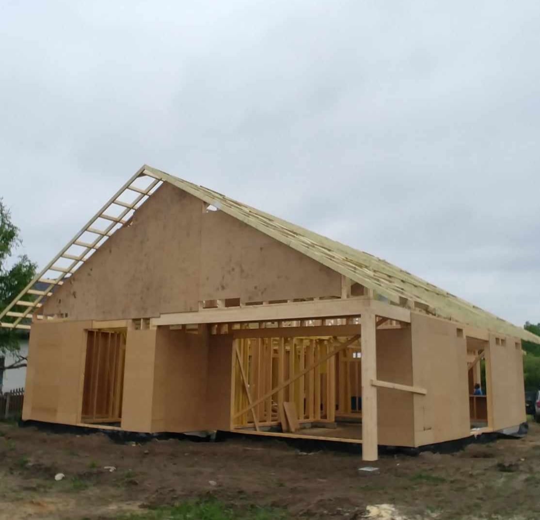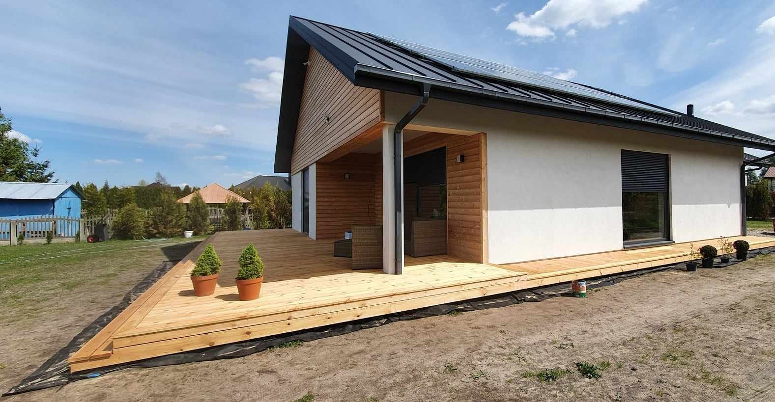 Konstrukcja domu szkieletowego z przekroju belek 160/60 świerk C24+płyta konstrukcyjna P5 + płyta drzewna pióro-wpust (Naturheld wand 60mm) ściany z zewnątrz + tynk elewacyjny