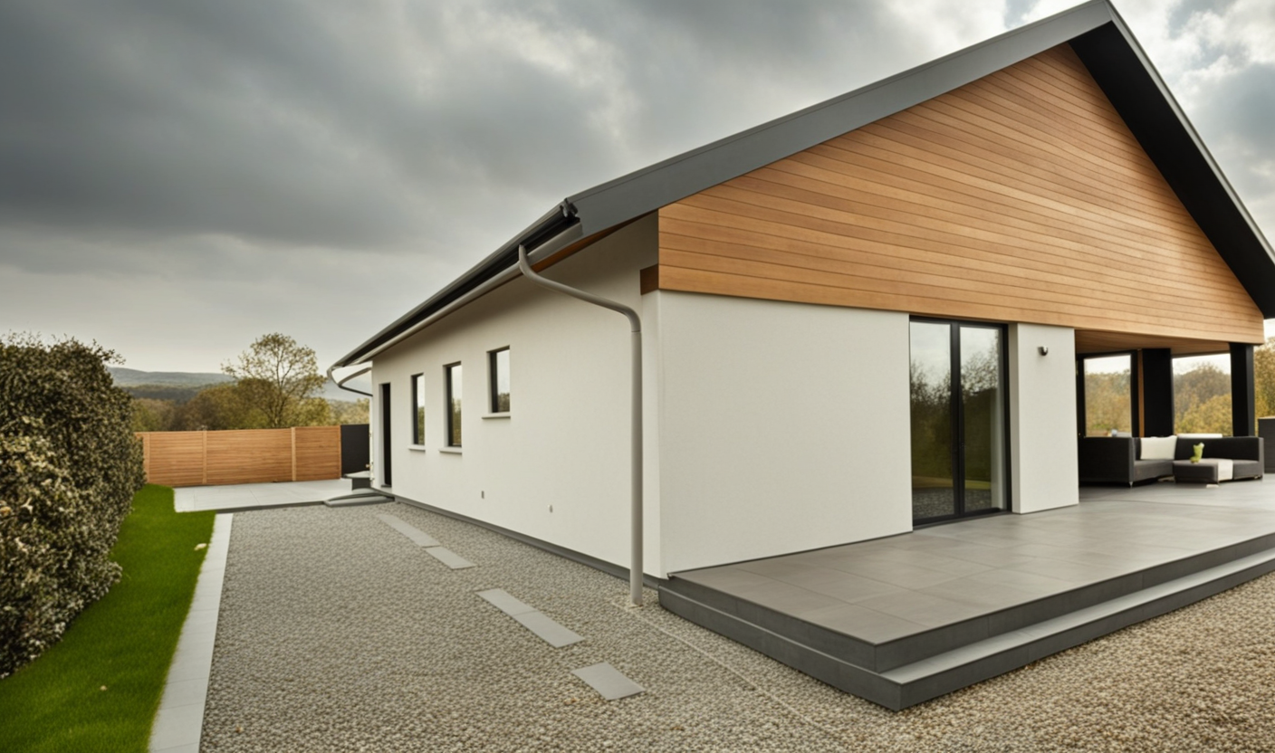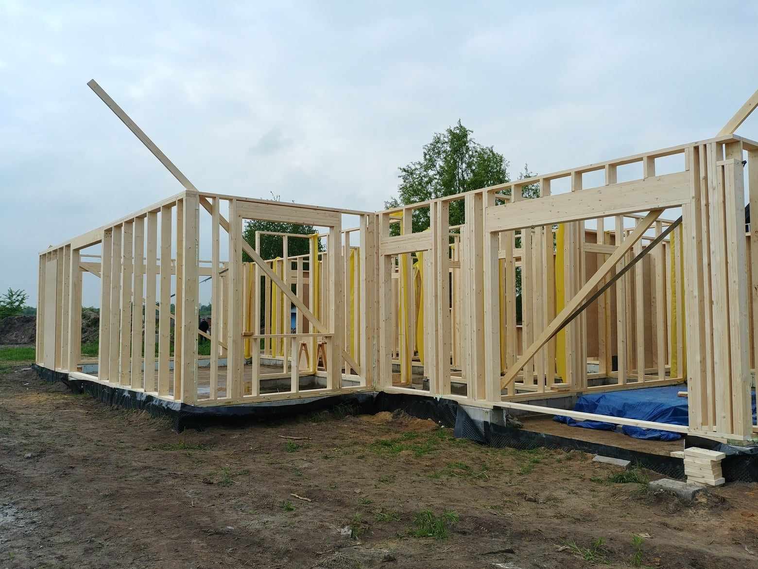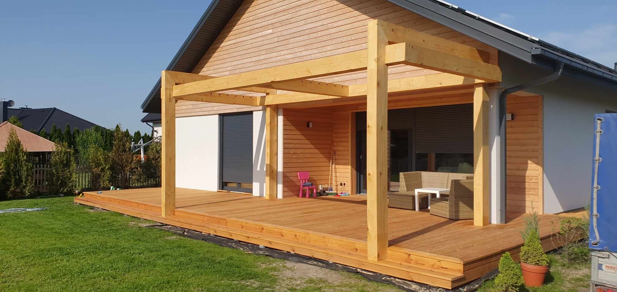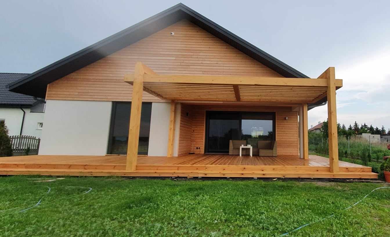 Konstrukcja domu szkieletowego z przekroju belek 160/60 świerk C24+płyta konstrukcyjna P5 + płyta drzewna pióro-wpust (Naturheld wand 60mm) ściany z zewnątrz + tynk elewacyjny