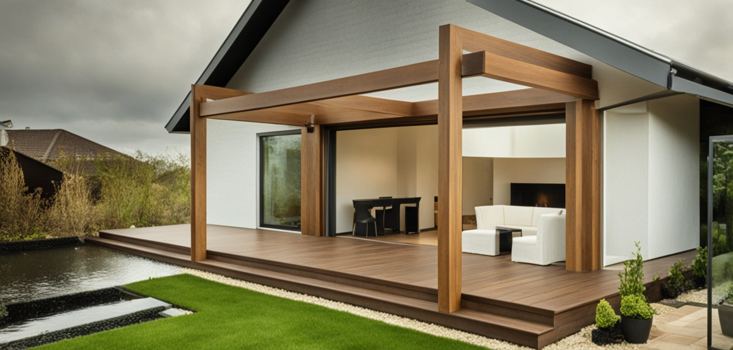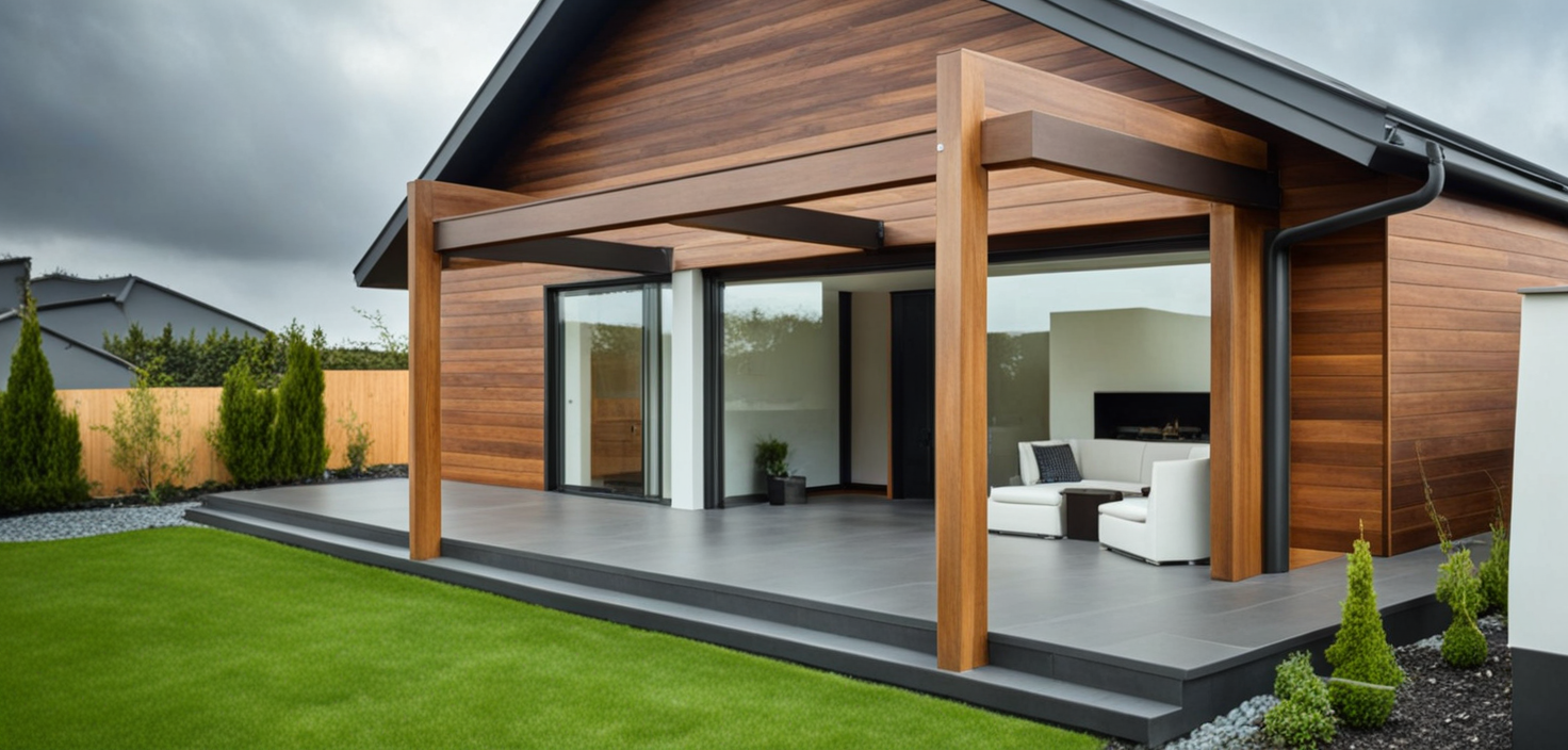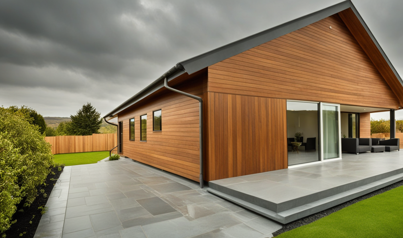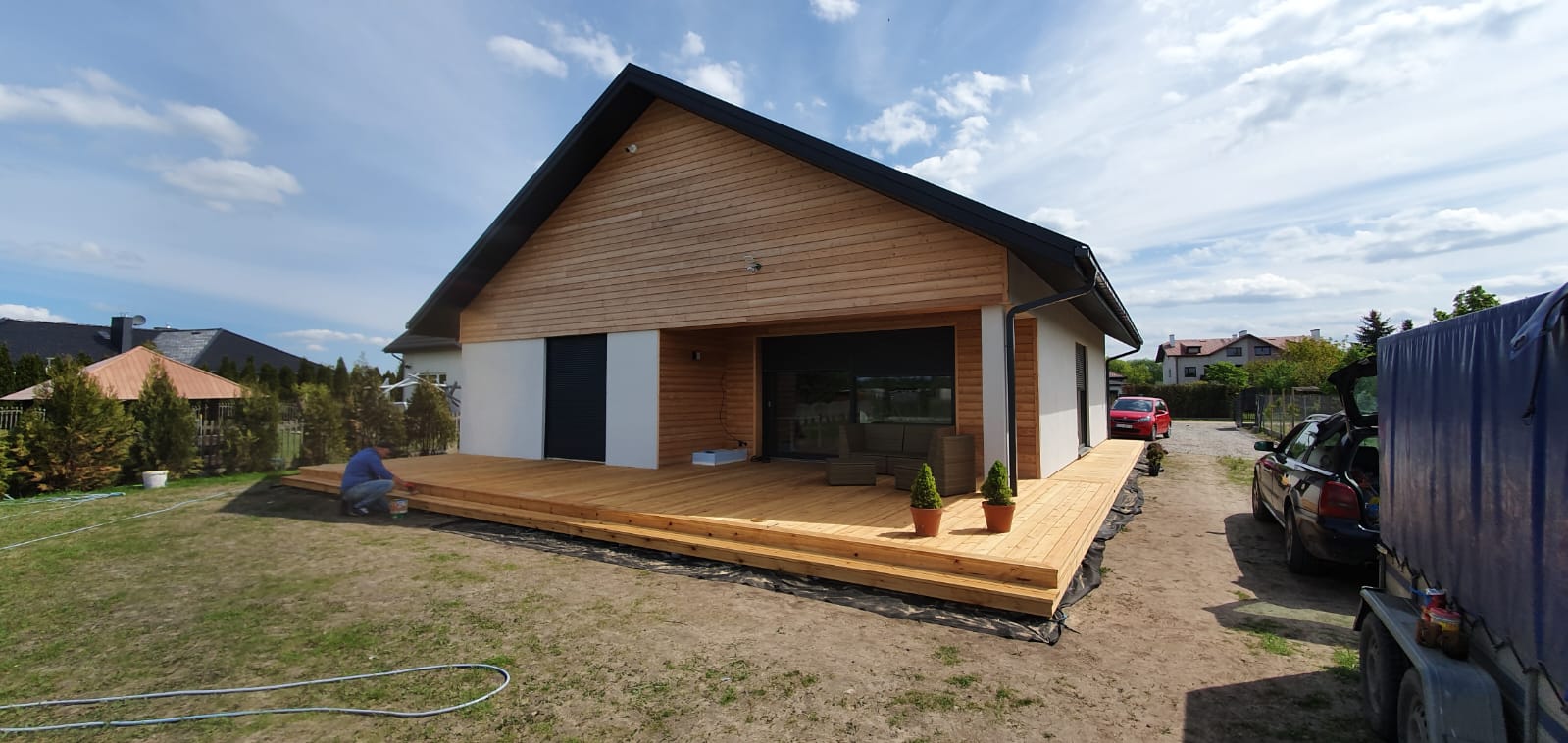 Konstrukcja domu szkieletowego z przekroju belek 160/60 świerk C24+płyta konstrukcyjna P5 + płyta drzewna pióro-wpust (Naturheld wand 60mm) ściany z zewnątrz + tynk elewacyjny