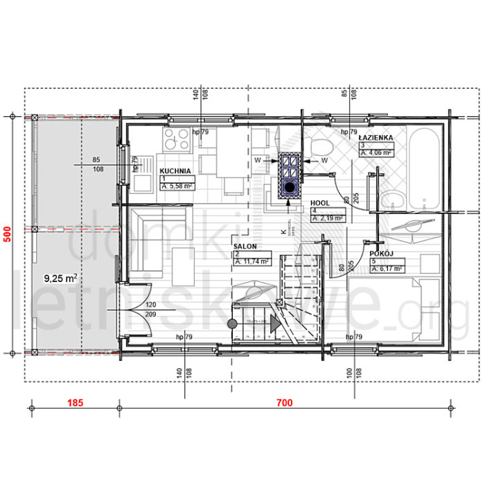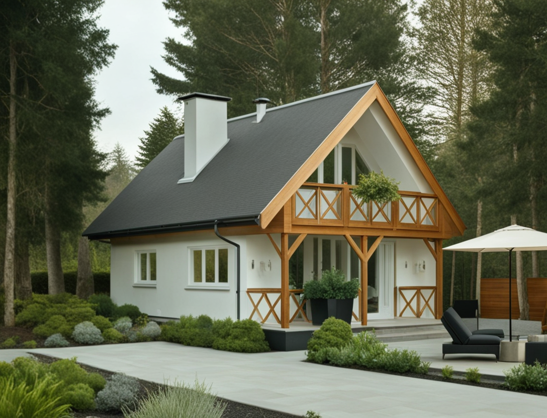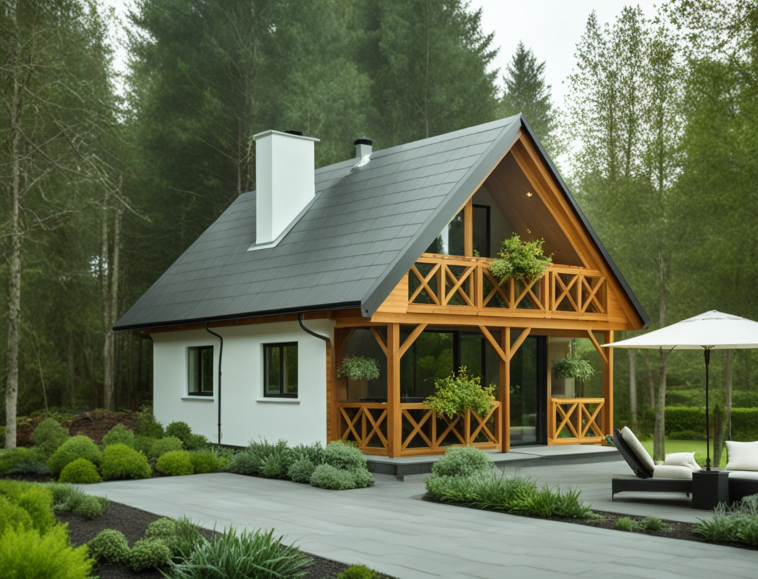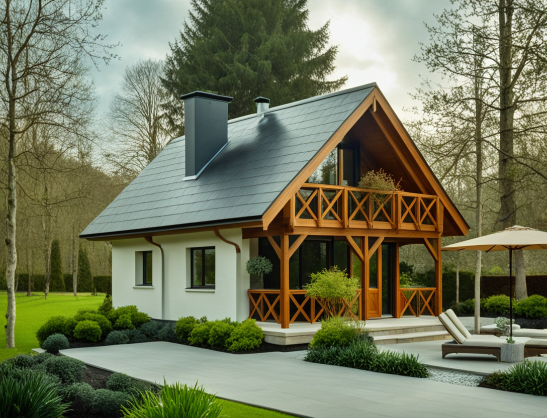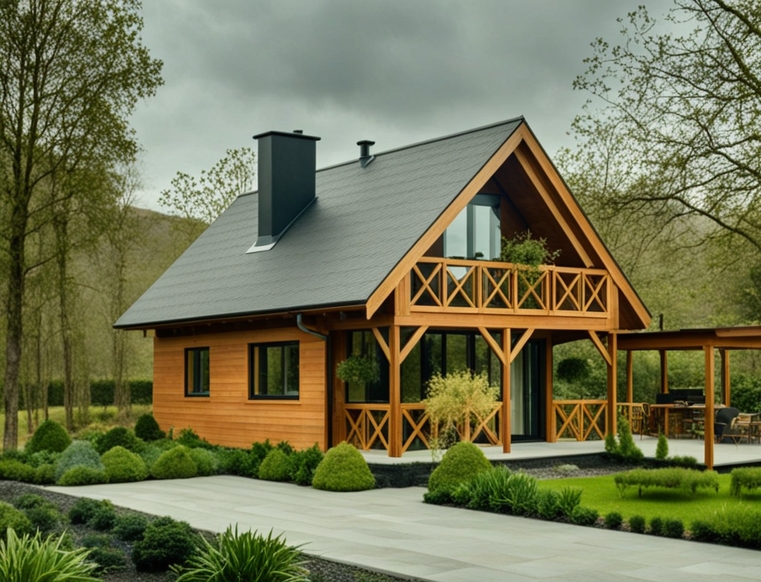 • Konstrukcja domu szkieletowego z przekroju belek 160/60 świerk C24+płyta konstrukcyjna P5 + płyta drzewna pióro-wpust (Naturheld wand 60mm) ściany z zewnątrz + tynk elewacyjny