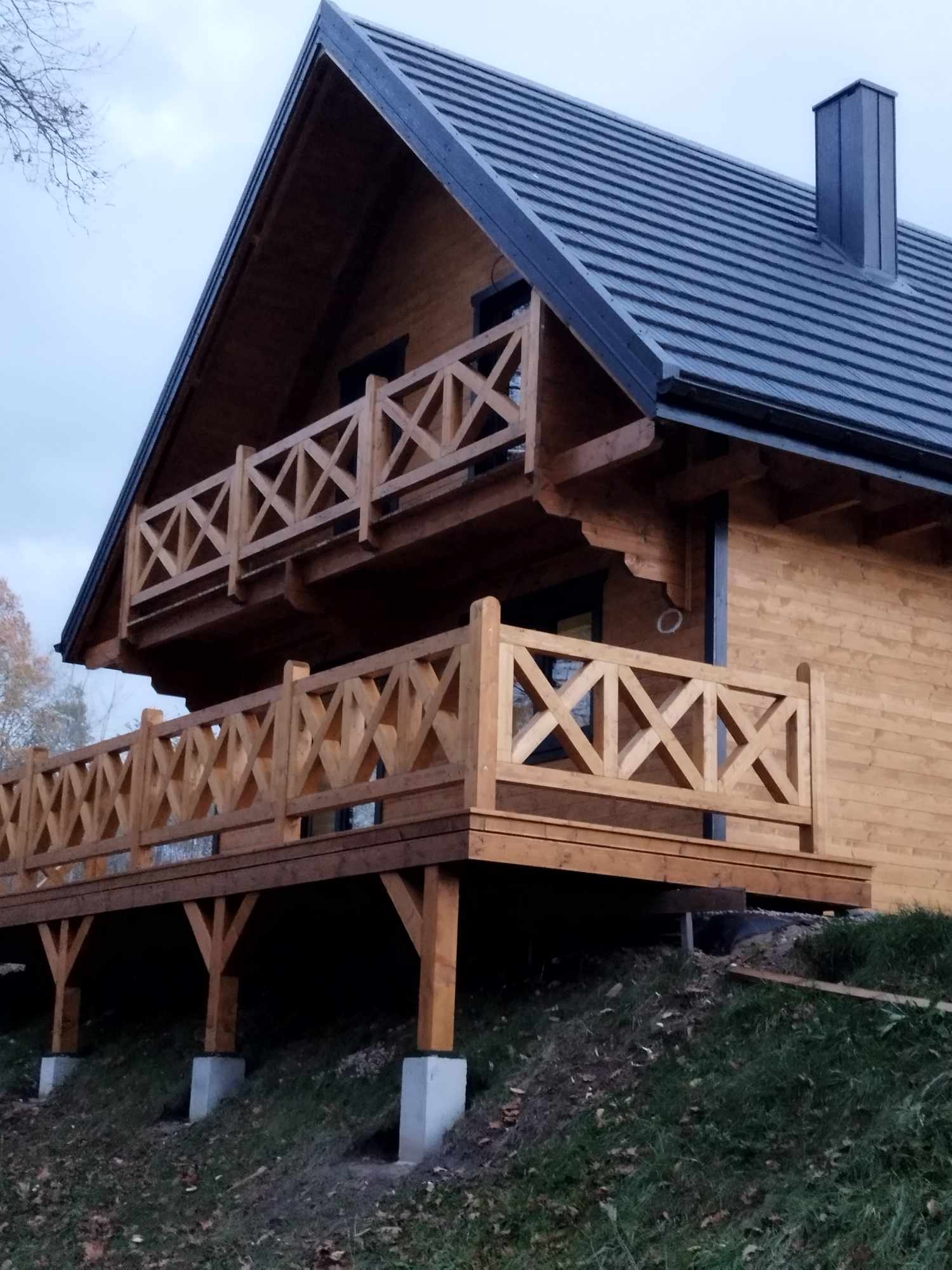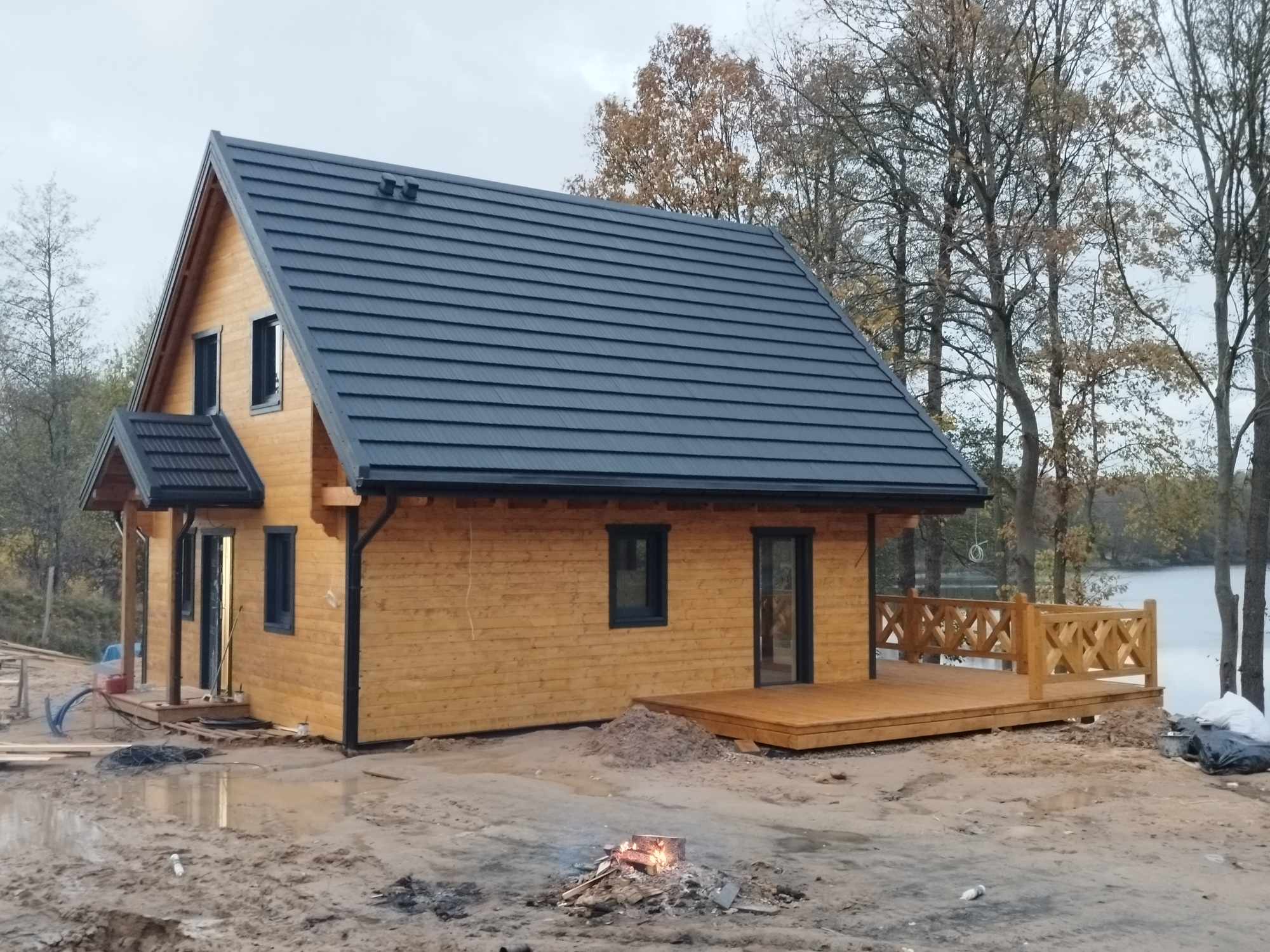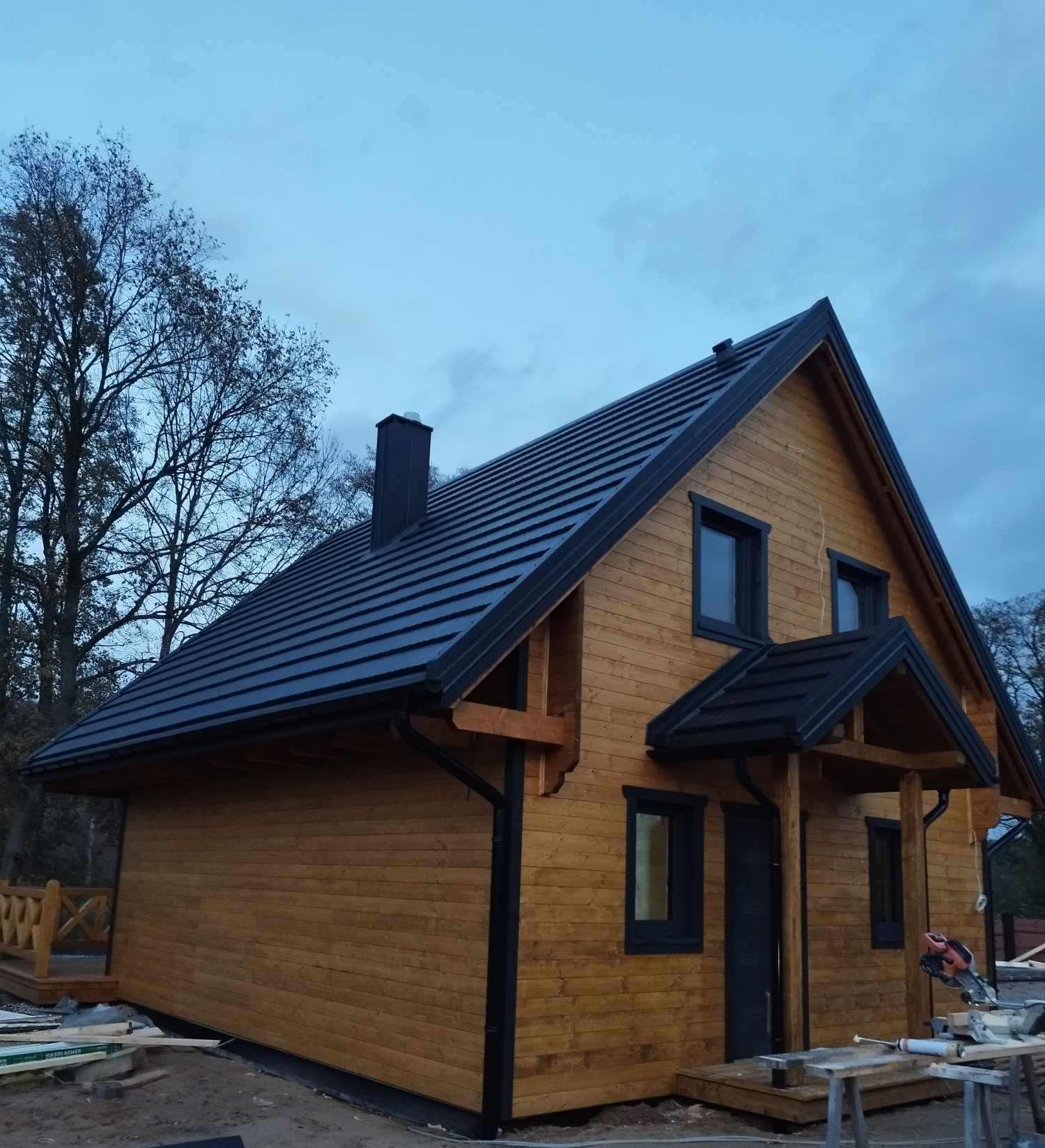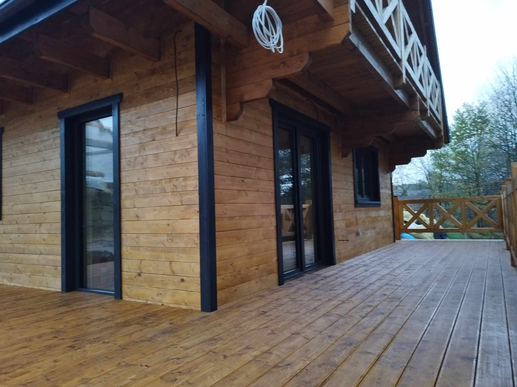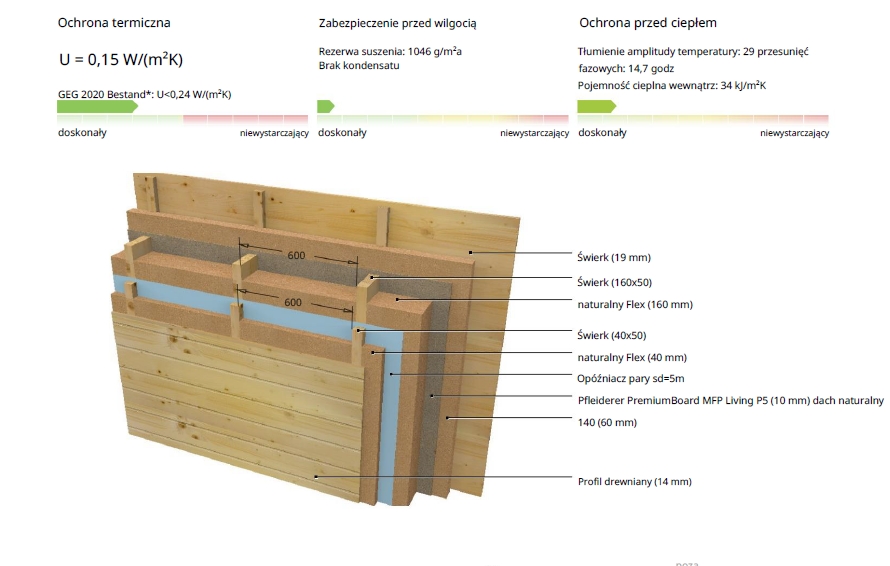 • Konstrukcja domu szkieletowego z przekroju belek 160/60 świerk C24+płyta konstrukcyjna P5 + płyta drzewna pióro-wpust (Naturheld wand 60mm) ściany z zewnątrz + tynk elewacyjny