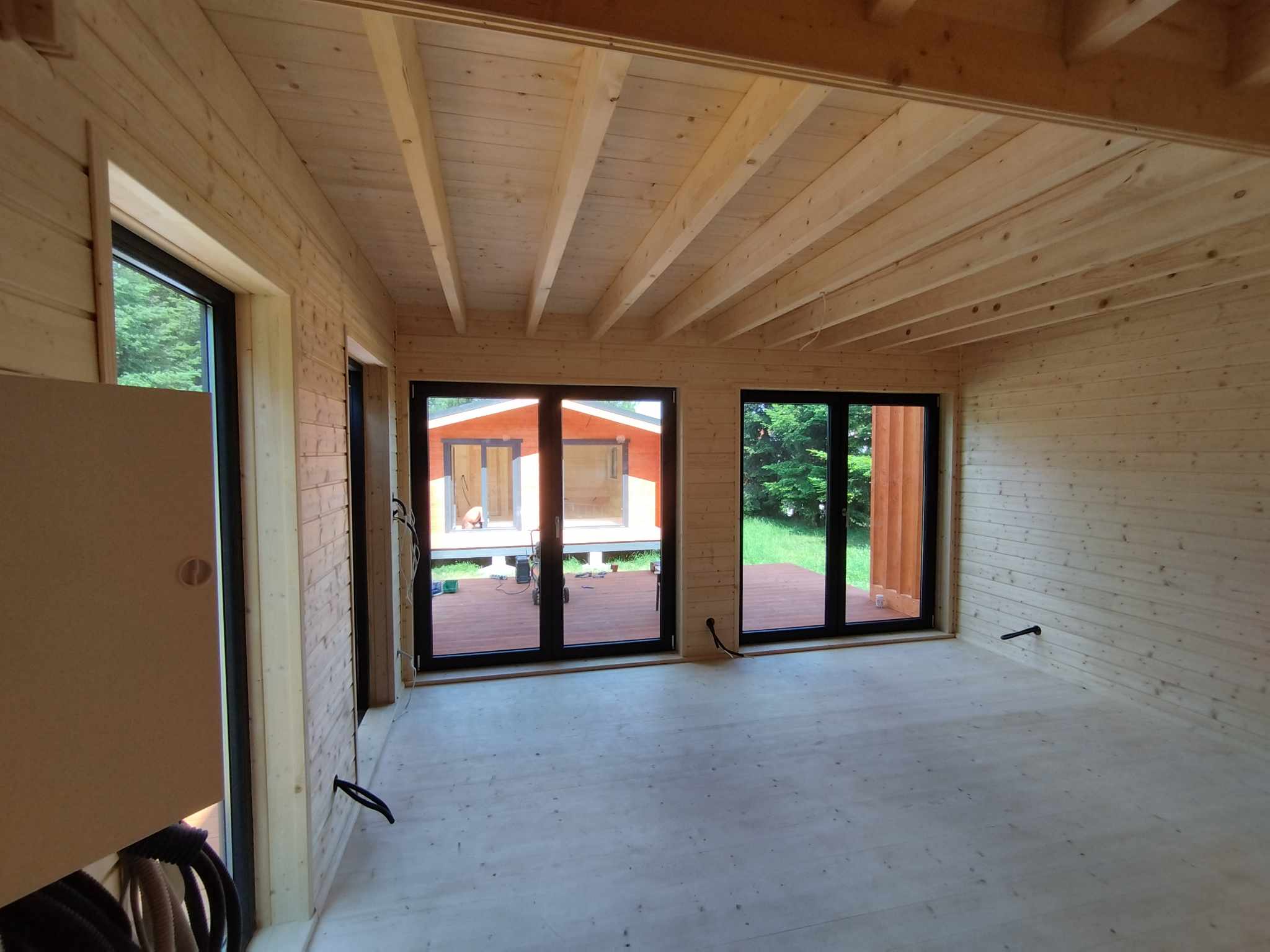 • Konstrukcja dachu przekrój belek 220/60 świerk C24 + płyta drzewna pióro-wpust (Naturheld Wand 60mm) z belkami stropowymi