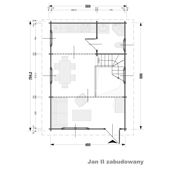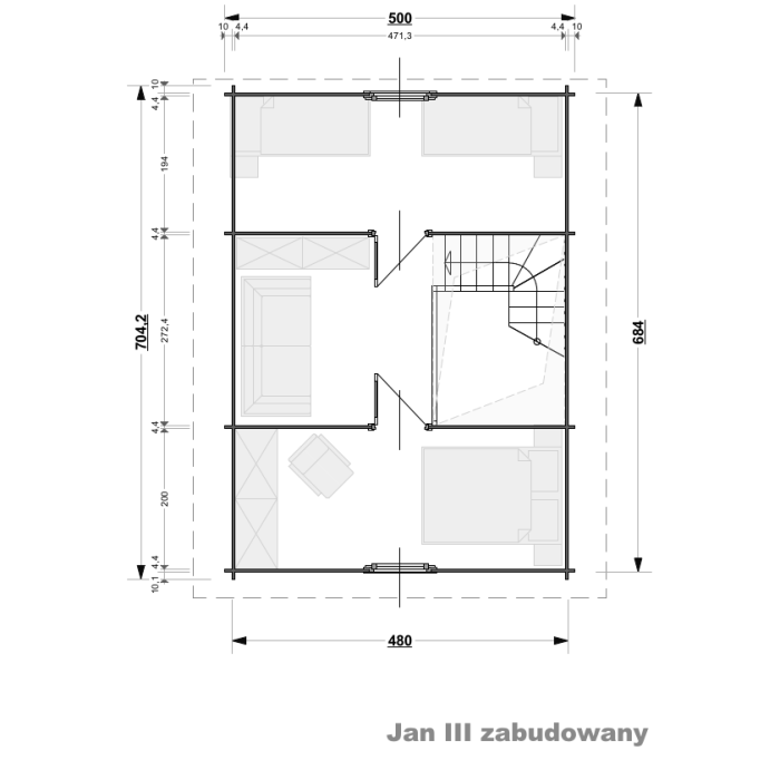 • Konstrukcja ścian wewnętrznych z przekroju 145/45 świerk C24