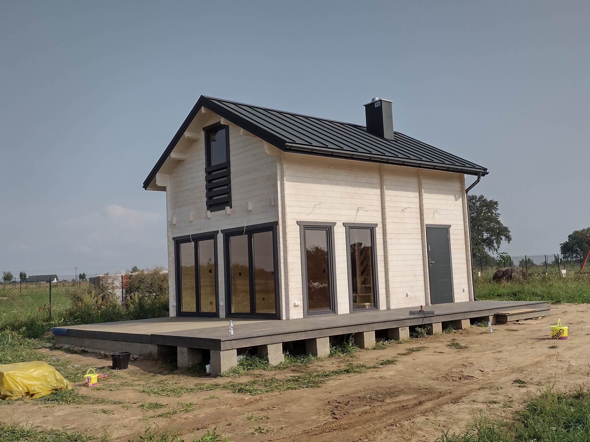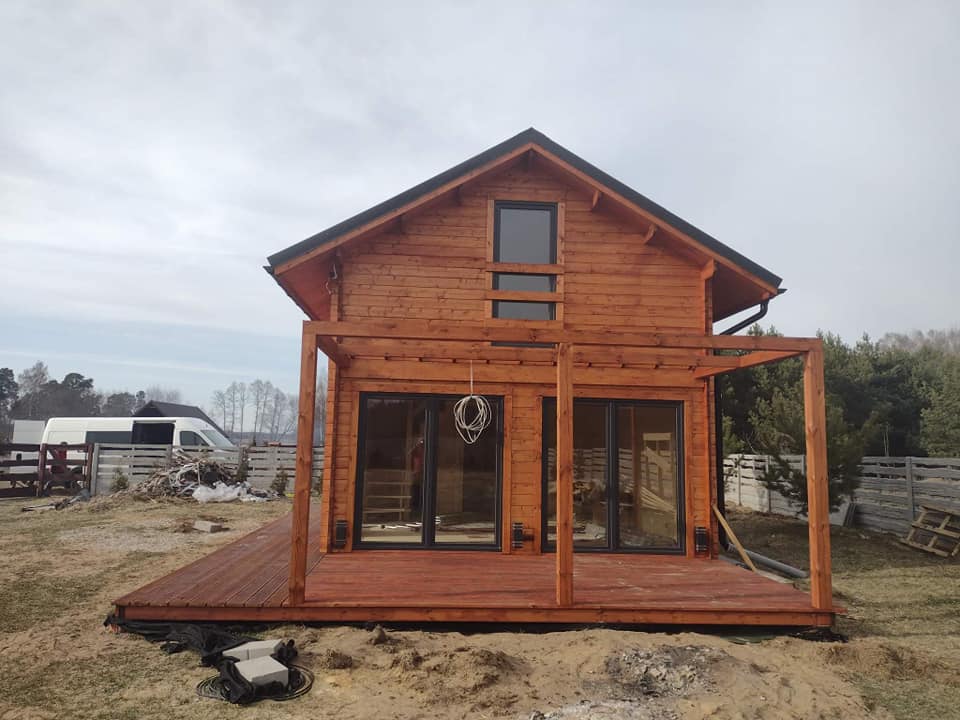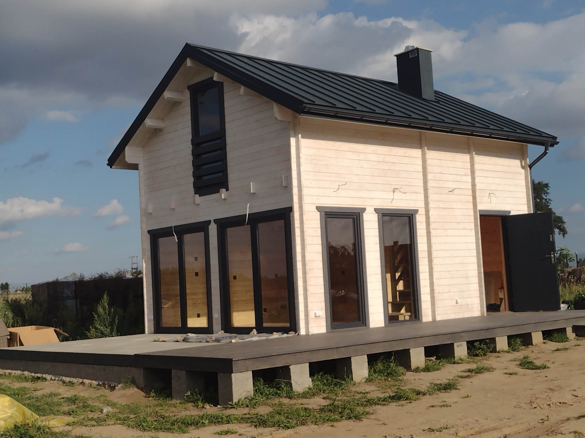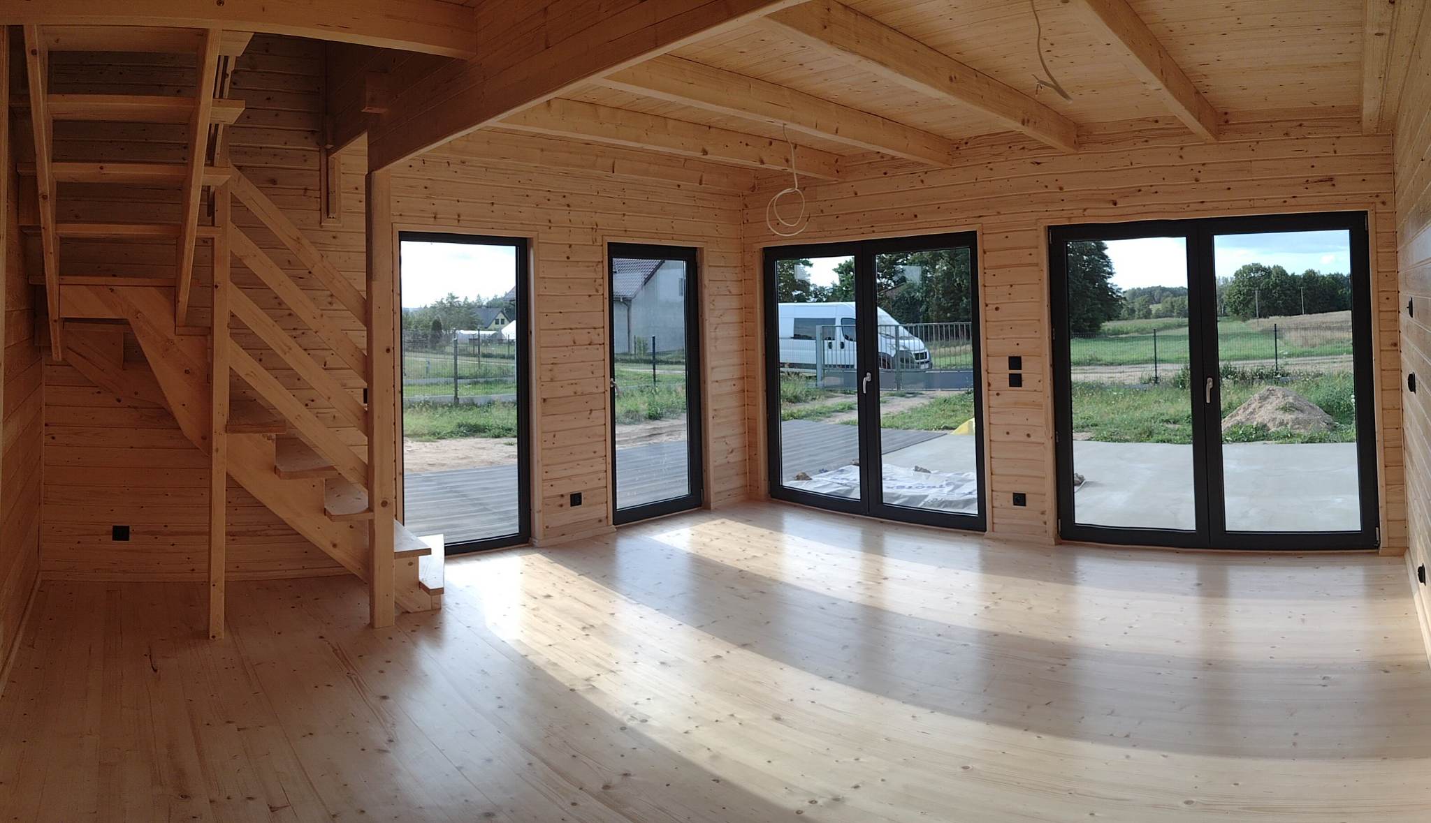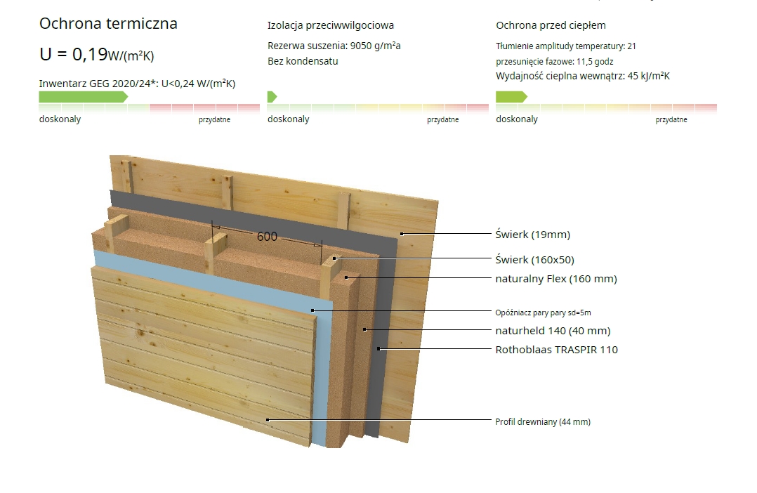 Konstrukcja domu szkieletowego z przekroju belek 160/60 świerk C24+płyta konstrukcyjna P5 + płyta drzewna pióro-wpust (Naturheld wand 60mm) ściany z zewnątrz + tynk elewacyjny