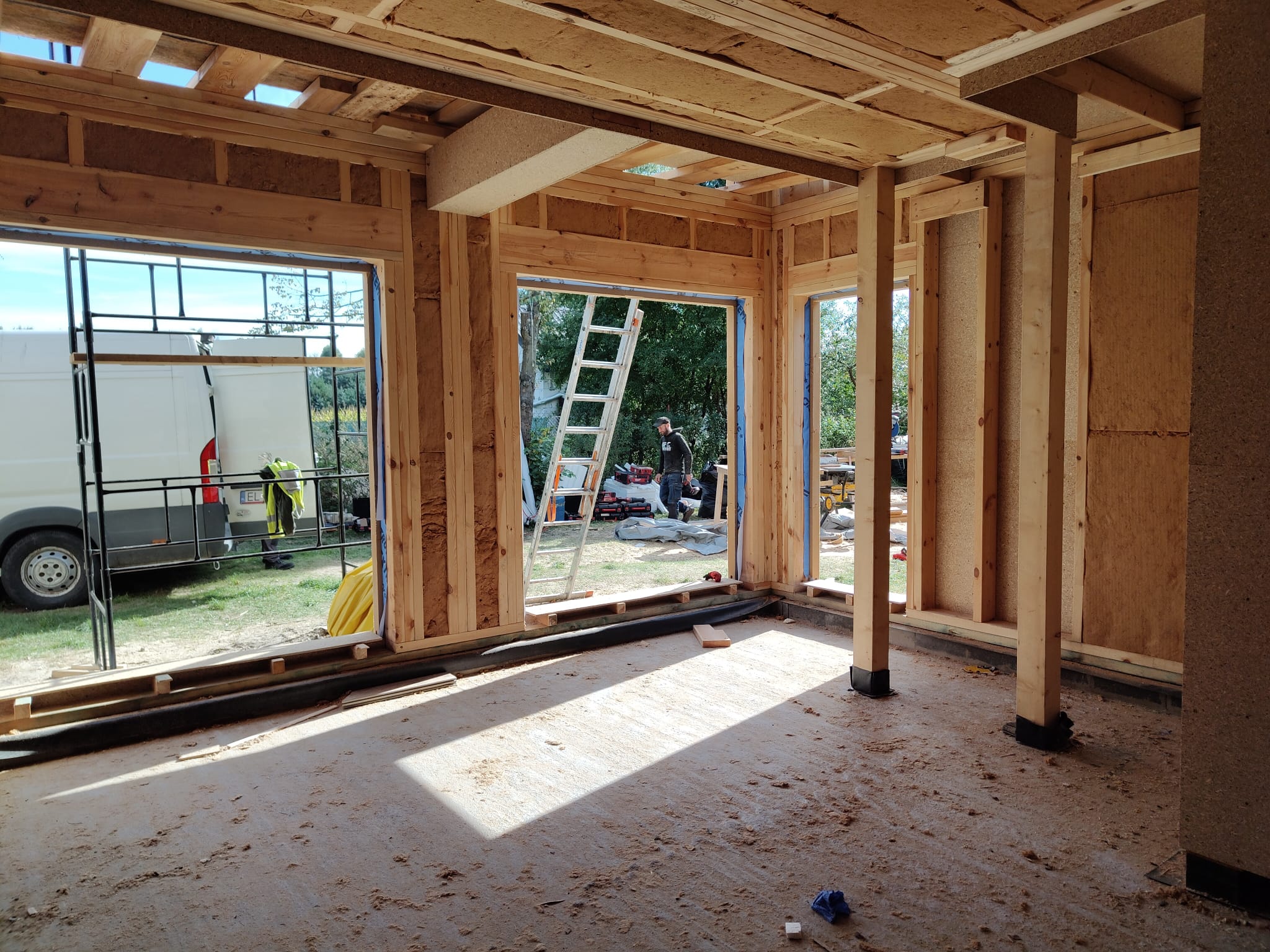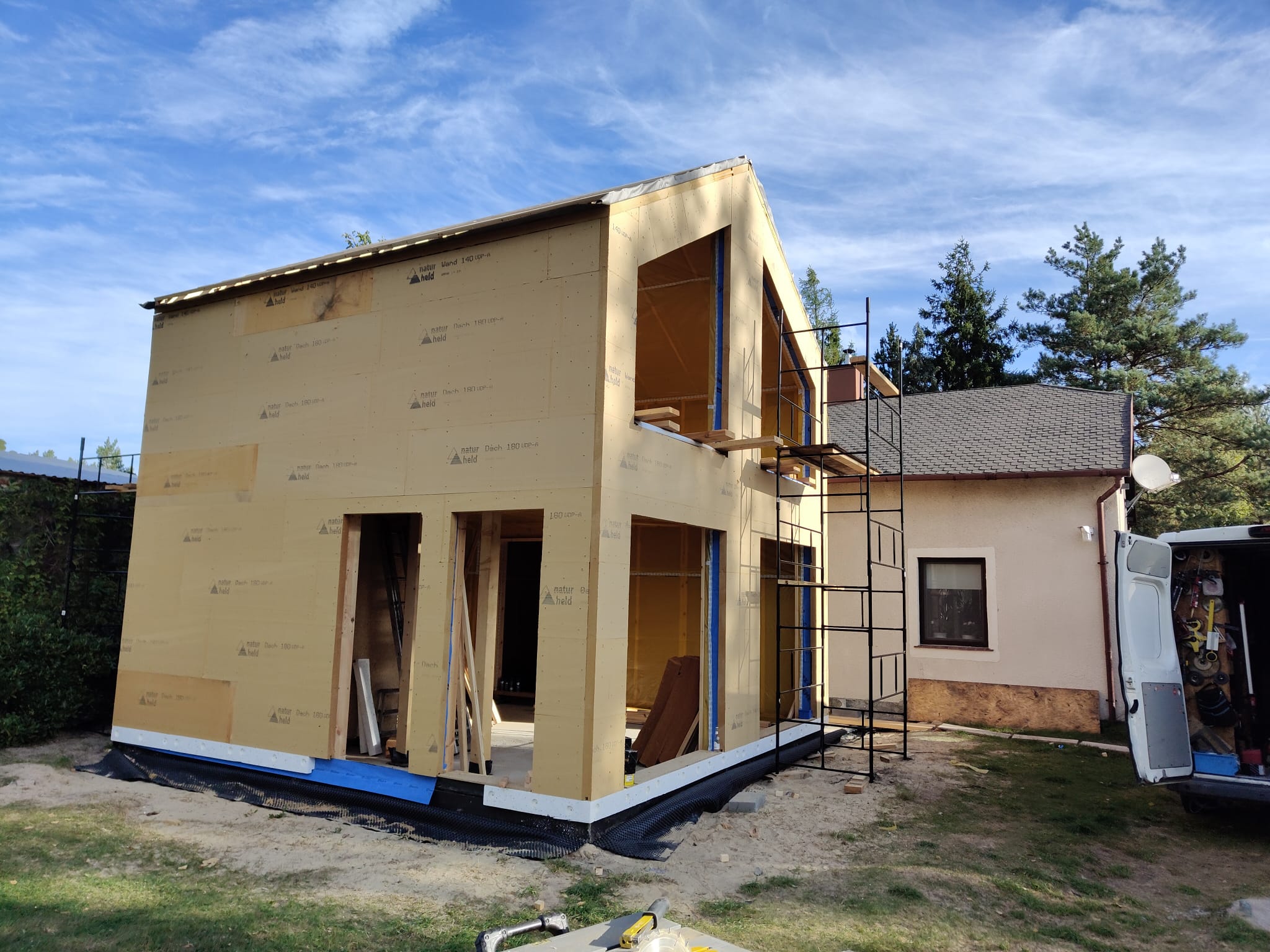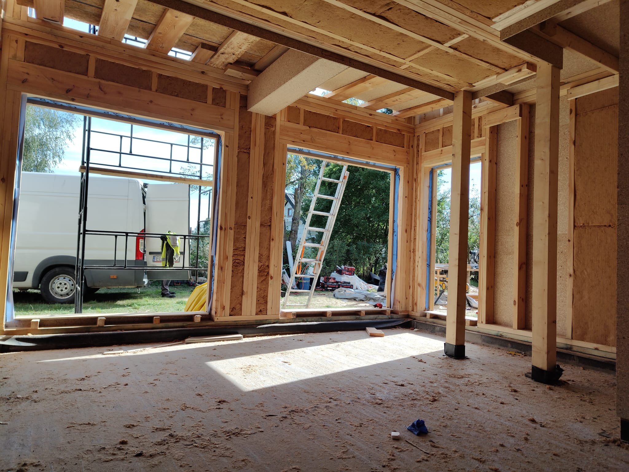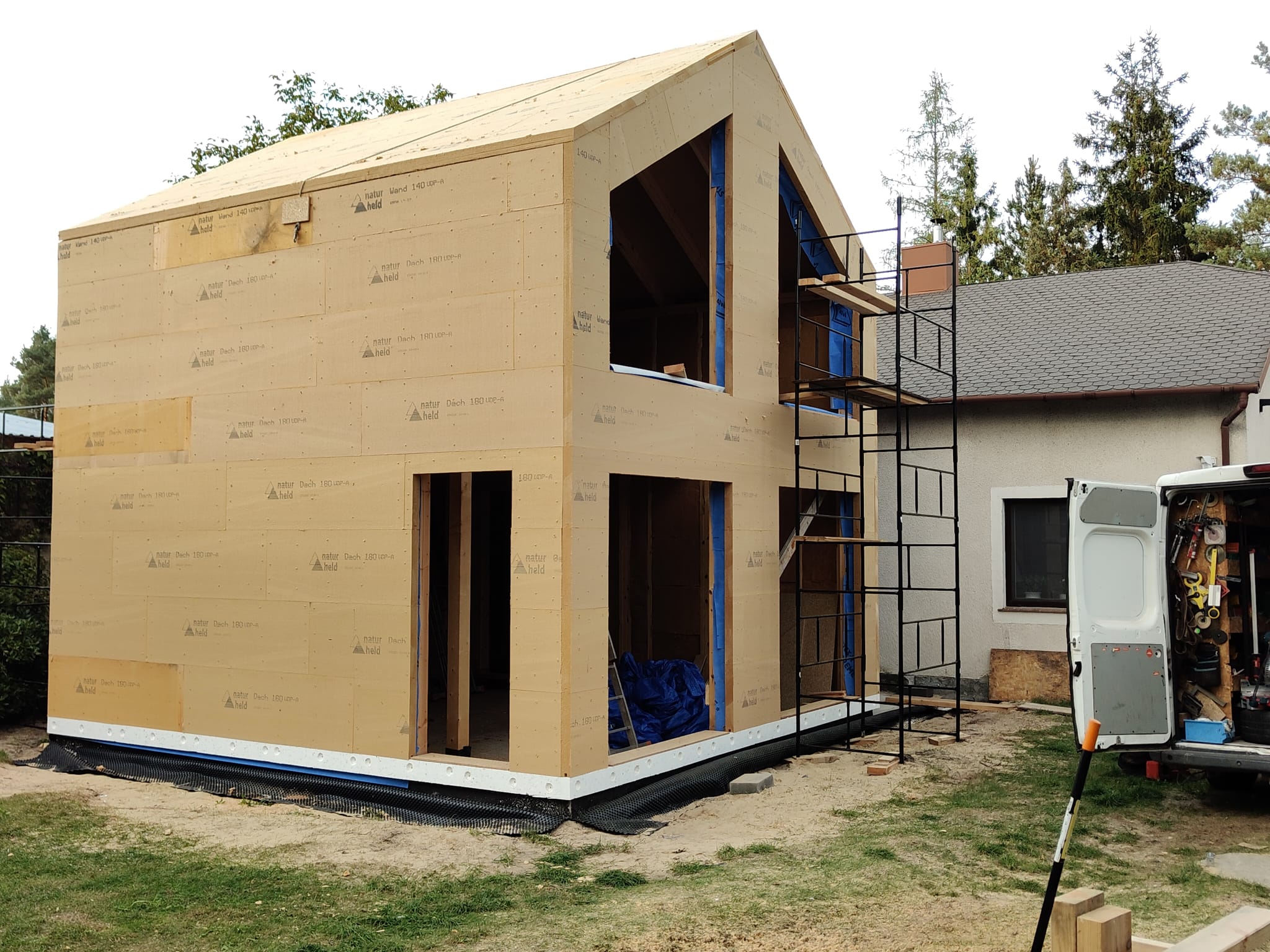 Konstrukcja domu szkieletowego z przekroju belek 160/60 świerk C24+płyta konstrukcyjna P5 + płyta drzewna pióro-wpust (Naturheld wand 60mm) ściany z zewnątrz + tynk elewacyjny