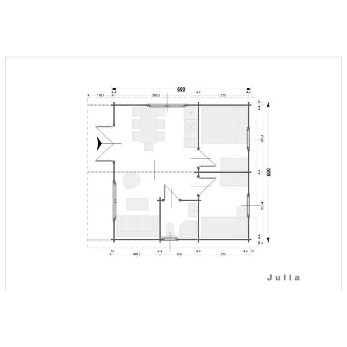 • Konstrukcja domu szkieletowego z przekroju belek 160/60 świerk C24+płyta konstrukcyjna P5 + płyta drzewna pióro-wpust (Naturheld wand 60mm) ściany z zewnątrz + tynk elewacyjny