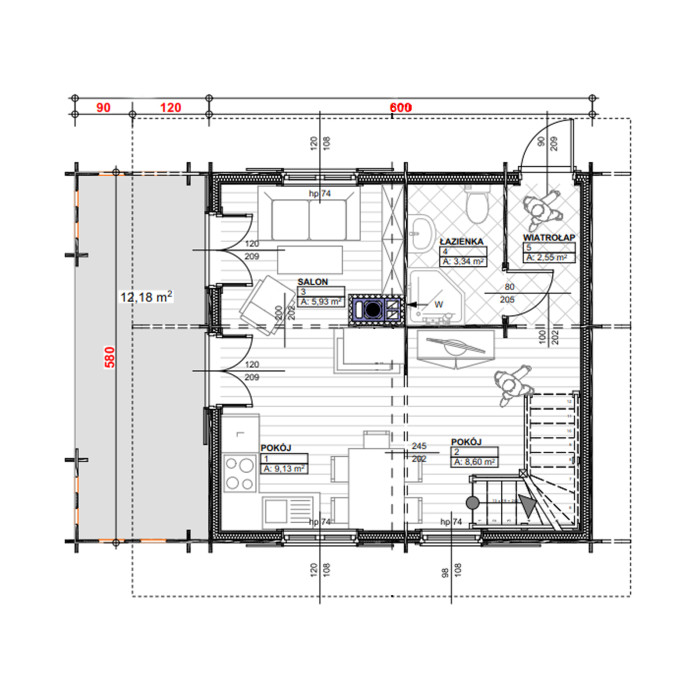 Wymiar belki podwalinowej: 45×95 mm
