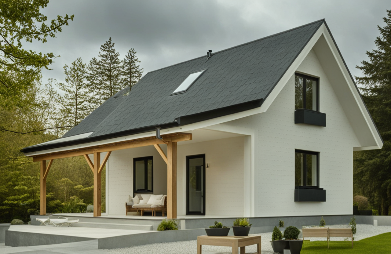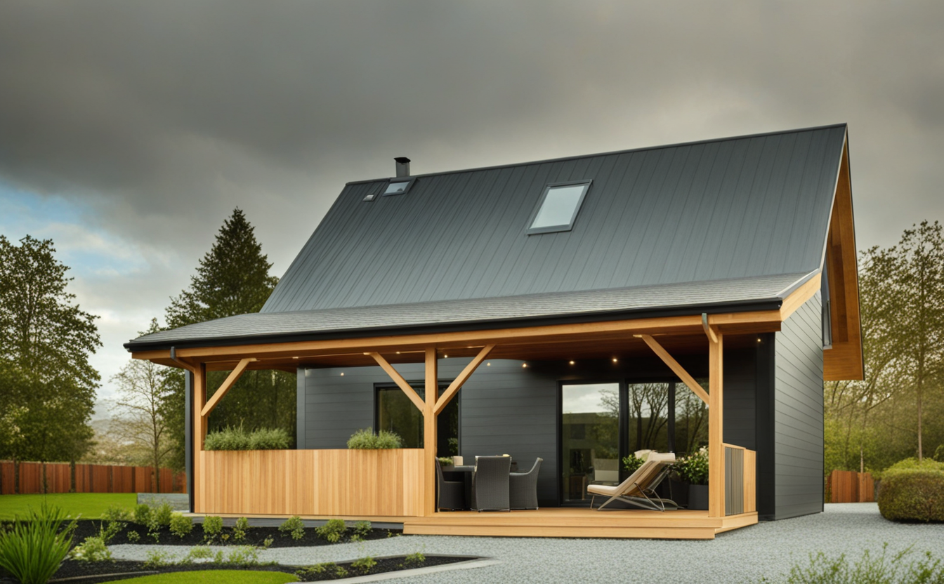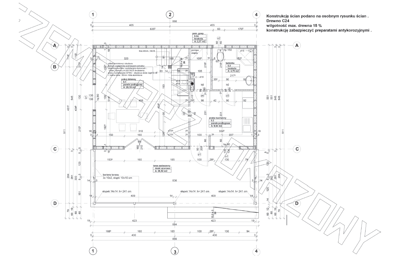 • Konstrukcja domu szkieletowego z przekroju belek 160/60 świerk C24+płyta konstrukcyjna P5 + płyta drzewna pióro-wpust (Naturheld wand 60mm) ściany z zewnątrz + tynk elewacyjny