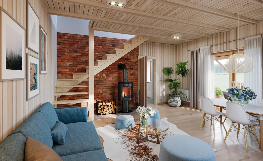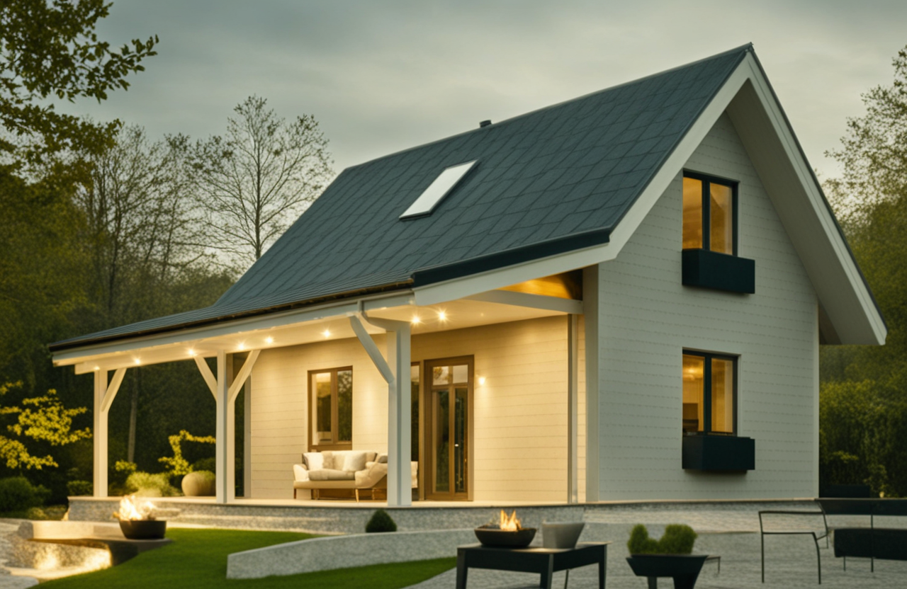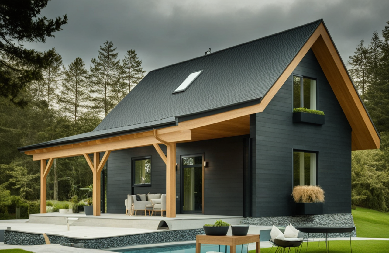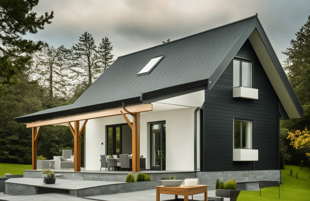 • Konstrukcja domu szkieletowego z przekroju belek 160/60 świerk C24+płyta konstrukcyjna P5 + płyta drzewna pióro-wpust (Naturheld wand 60mm) ściany z zewnątrz + tynk elewacyjny